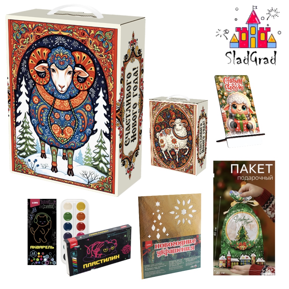 1. Коробка подарочная "Мечта" с пластиковой ручкой Габариты: 23.5х10х30.5см 2. Новогодние украшения на окно (золото). Набор №5 3. Подставка под телефон/планшет Овечка Милашка Габариты: 9*10*7 см 4. Акварель КИБЕРКОТИКИ, 12 цветов, б/к 5. Пластилин КИБЕРКОТИКИ 6 цв, 15 гр, пенал 6. КОНДИТЕРСКИЙ СОСТАВ 1200г