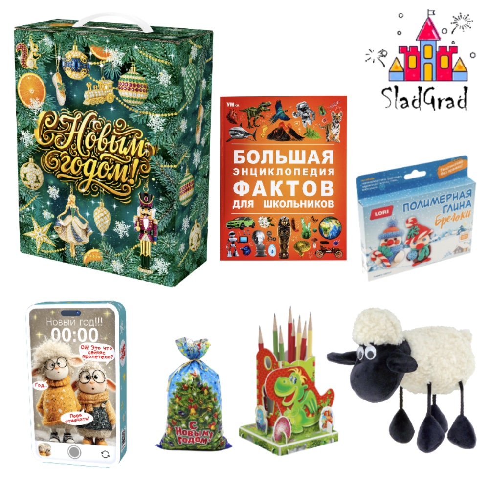 1. Коробка малая подарочная "Шик-блеск" с пластиковой ручкой Габариты: 23.5х10х30.5см 2. Большая энциклопедия фактов для школьников. Энциклопедия. 197х255 мм. 3. 3Д пазл карандашница "Динозавр" Габариты: 8.5х8.5х11 см 4. Игрушка Шпулька Габариты: 20х9х10 см 5. Полимерная глина. Брелоки "Зимние друзья" 6. Смартфон " На стиле" Габариты: 12.5х4х21.6см 7. КОНДИТЕРСКИЙ СОСТАВ 500г