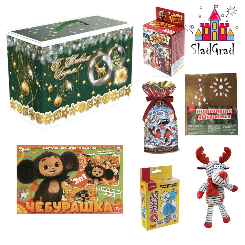 1. Коробка "Праздничная" Габариты: 34х16х23.5 см 2. Чебурашка. Настольная игра-ходилка 2в1. 330х217х27мм. Умные игры 3. Настольная игра стоп-шары, 9,3*14,7*5,8 см Умные игры 4. Игрушка "Лосик" Габариты: 22см 5.Выращивание кристаллов Стикерняшки "Яркий бабл ти", голубой кристалл 6. Новогодние украшения на окно (золото). Набор №5 7. Пакет для конфет с атласной лентой "Снегири-озорники" Габариты: 6х13.5х37,5см 8. КОНДИТЕРСКИЙ СОСТАВ 800г