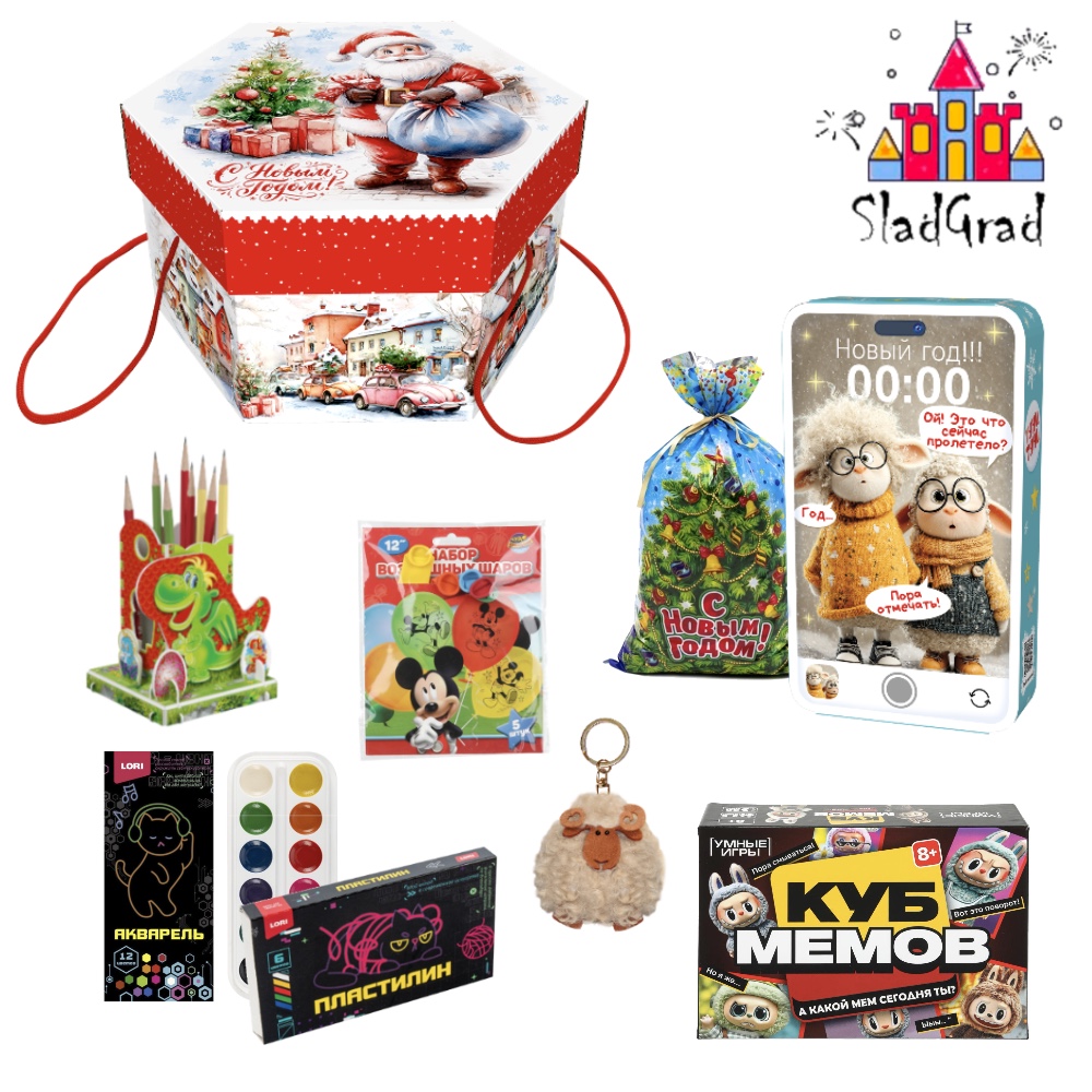 1. Коробка "Дар" с верёвочными ручками , с видеоанимацией 2. Латексные шары - набор 5 шт шары латекс монохром микки маус ЧУДО ПРАЗДНИК Габариты: 1x15x19 см 3. Брелок Пухляш 4. Акварель КИБЕРКОТИКИ, 12 цветов, б/к 5. Пластилин КИБЕРКОТИКИ 6 цв, 15 гр, пенал 6. Куб мемов. Лабубу. Карточная игра в плотной коробке. 160х110х40 мм. Умные игры 7. Смартфон " На стиле" Габариты: 12.5х4х21.6см 8. 3Д пазл карандашница "Динозавр" Габариты: 8.5х8.5х11 см 9. КОНДИТЕРСКИЙ СОСТАВ 500г